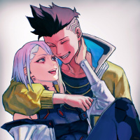 spiky hair, and the other character is female with short gray hair. They are both smiling and seem to be in a friendly or affectionate embrace, suggesting they have