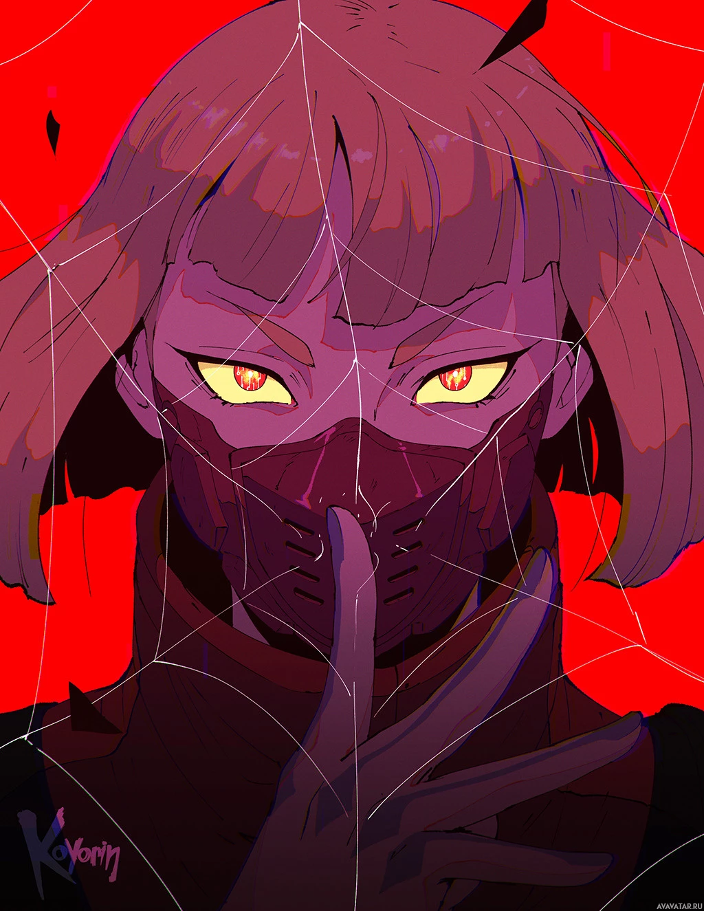 На картинке изображен анимационный персонаж в стиле киберпанк. Персонаж одет в маску и имеет стилизованный футуристический дизайн, который соответствует тематике Киберпанк 2077. Глаза у персонажа красные, что придает рисунку острый и насыщенный вид. Фон темный, с красными элементами, которые создают общую мрачную атмосферу изображения.