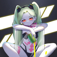 the video game "Cyberpunk 2077." The character is depicted in a stylized, anime-like fashion and has distinctive