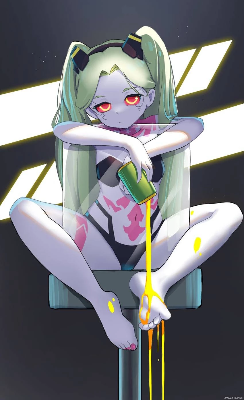 cybernetic implants. She is sitting on what looks like a stage with spotlights around her, and there are splatters of yellow liquid near her feet, possibly representing some sort of performance or