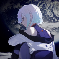 blonde hair and a cyberpunk-style outfit. This character is sitting on what appears to be the surface of the moon or another