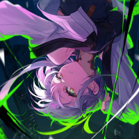 green energy or aura effects surrounding her head. Her expression seems intense and focused as she gazes ahead. The style of the artwork leans towards