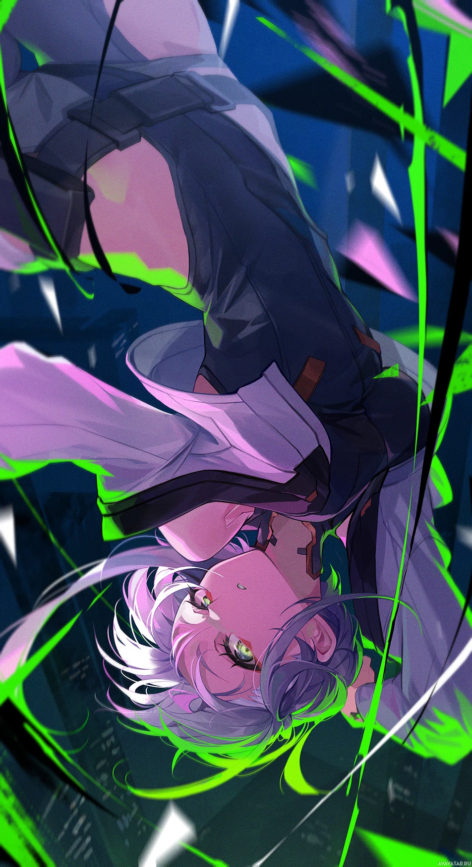 the video game Cyberpunk 2077. She is depicted upside down, with