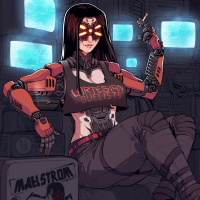 an illustrated character, who appears to be a cyberpunk or science fiction-inspired female robot. She has