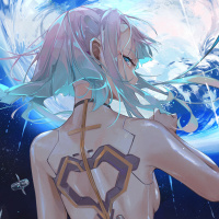 blonde hair with blue accents and is wearing what appears to be advanced technology or armor on her back. The background suggests