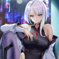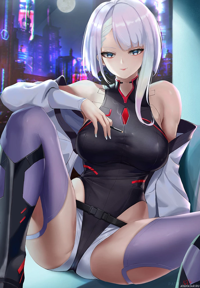 an animated character that resembles Lucy from the game "Cyberpunk 2077." She is shown with a futuristic