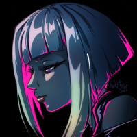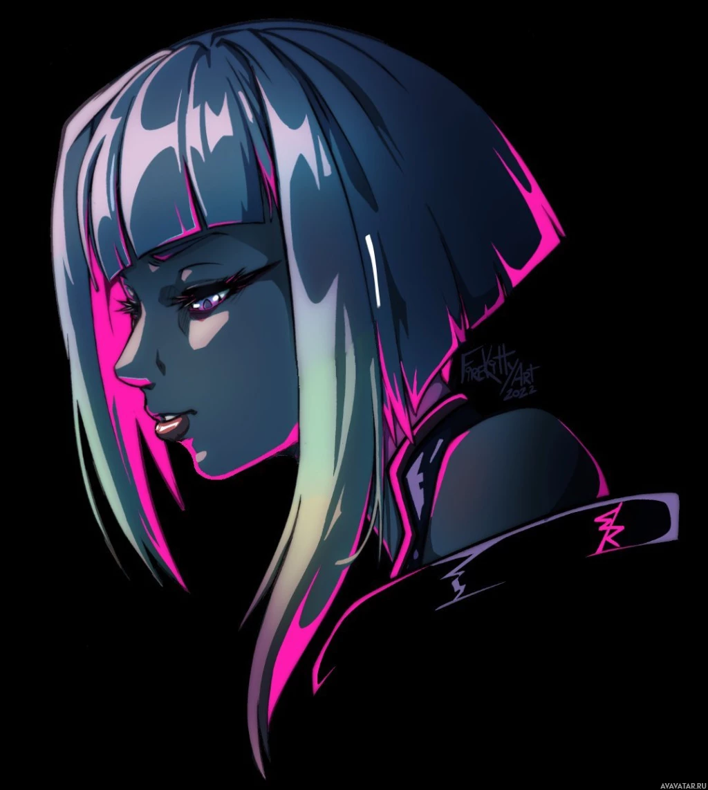 the video game "Cyberpunk 2077." She is depicted with a cool and serious expression, wearing what looks like futuristic or cyber-themed clothing. The artwork has a vibrant color scheme with neon pinks and blues, which contributes to the overall cyberpunk aesthetic of
