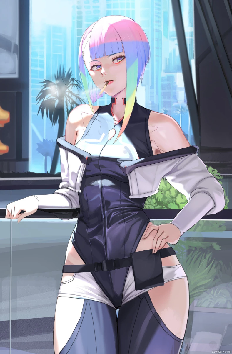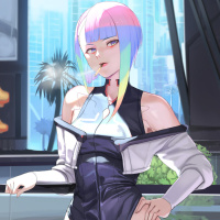 the video game Cyberpunk 2077. The character is styled in a futuristic fashion typical of the cyberpunk genre, featuring vibrant