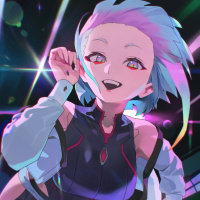 an animated character who appears to be a fusion of Lucy from the "Cyberpunk 2077" series and an anime-style design. The character is depicted with blonde hair, wearing futuristic armor that resembles Lucy's iconic outfit in