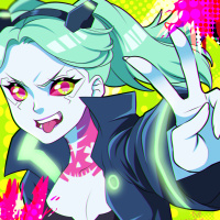 an illustrated character who appears to be a female with green hair and a blue jacket, wearing a black top. She has red eyes and is depicted in