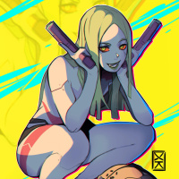 an illustrated character, Rebecca from the game "Cyberpunk 2077." She is shown crouching and holding a pistol with her left hand. Her expression appears to be intense or focused, and there's