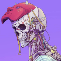 a human skull for a head. There is a mask placed over