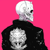 mechanical components and a back view of the body, which appears to be humanoid in shape, suggesting it might have human-like proportions or features. The robot is wearing a jacket with a prominent emblem on the back that resembles a Japanese demon mask, known as an Oni mask, which typically represents
