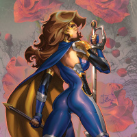a female figure dressed in a blue and gold costume with a cloak. She is holding what appears to be