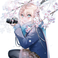 a school uniform consisting of a dark jacket over a light-colored top, with a scarf around her neck, suggesting it might be cold weather. The character has a camera in her hands, possibly taking a photo. In the background, there are cherry