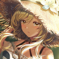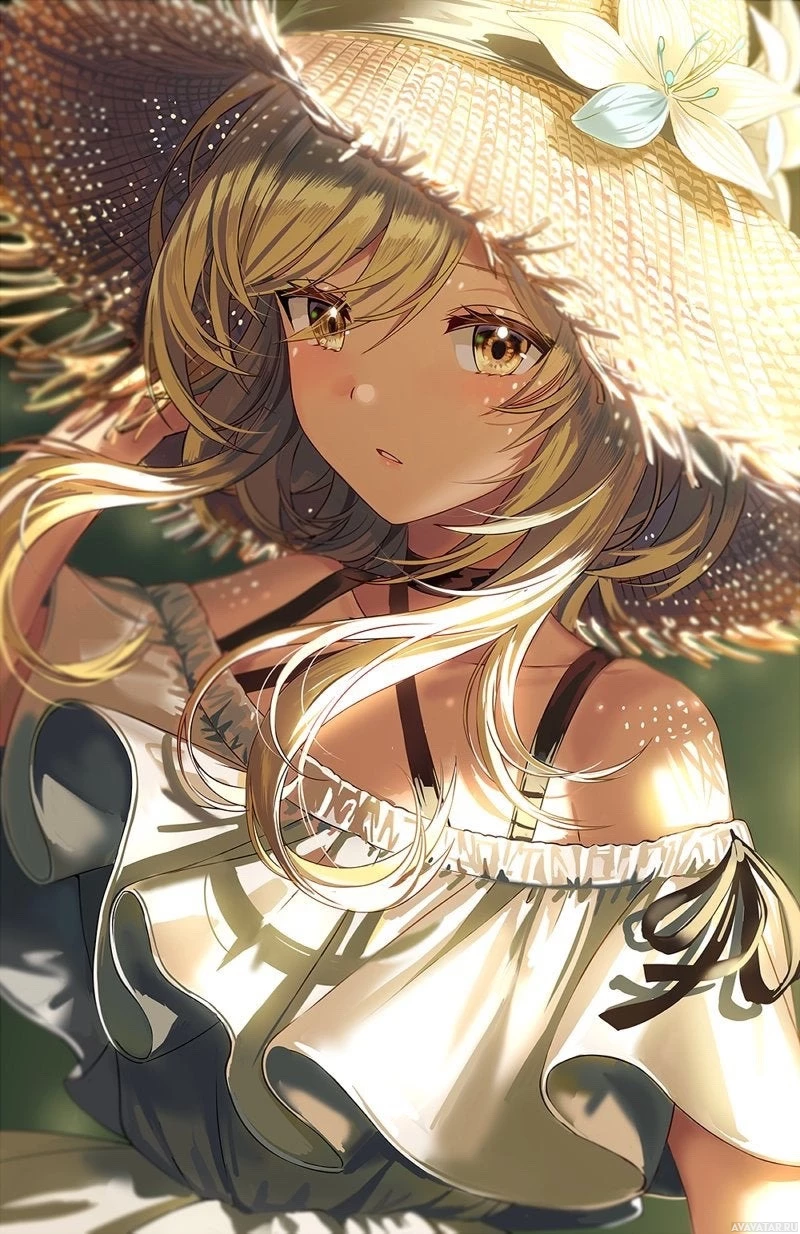 a white dress with frills at the sleeves, complemented by a straw hat adorned with what appears to be flowers or feathers on the brim. The style of her outfit suggests a light-hearted or possibly fantastical setting, which is common in anime and manga artwork. Her expression seems contemplative or shy as she looks towards the viewer.