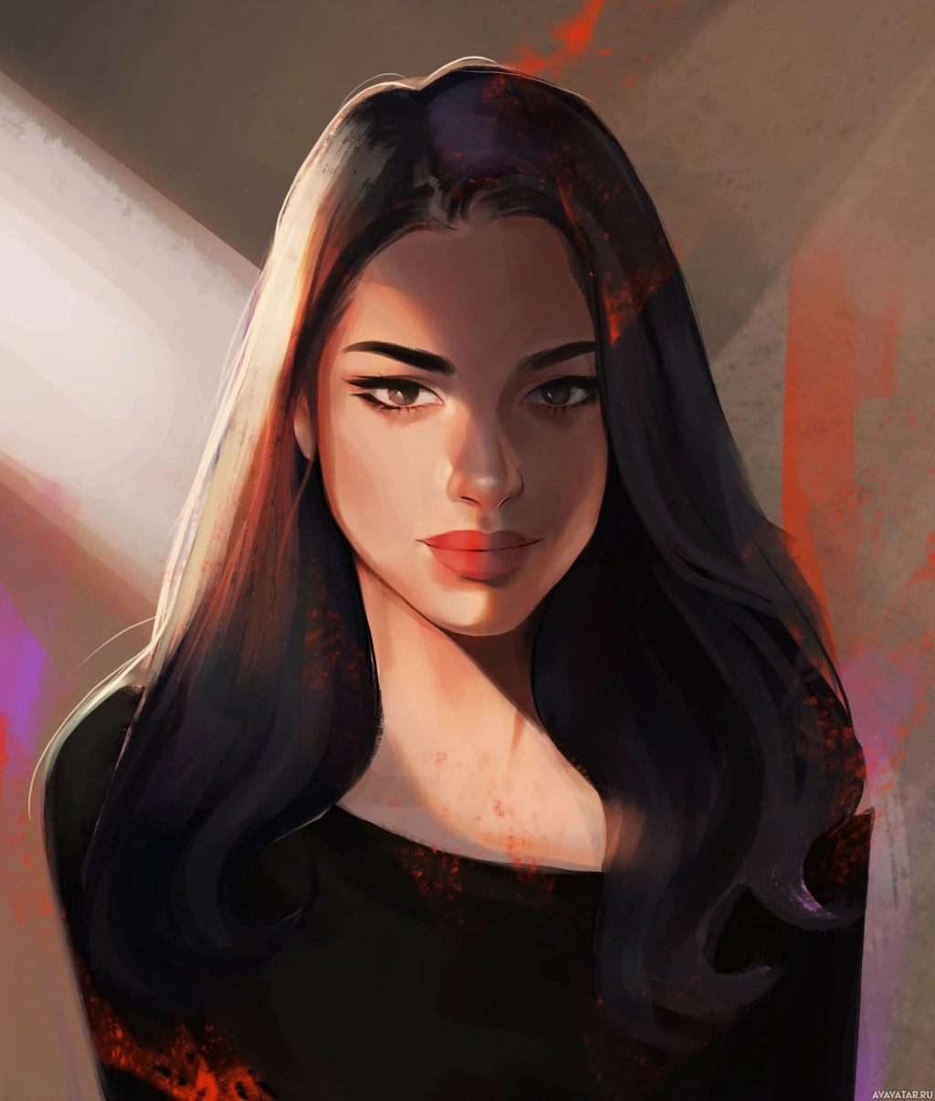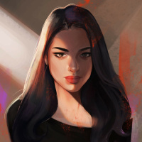 dark hair, depicted in an illustration style. She is wearing what appears to be