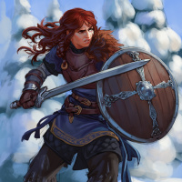 На картинке изображена рыжеволосая девушка, похожая на воина. Она держит меч и стоит на фоне заснеженных деревьев, что наводит на мысль о том, что она, возможно, находится в холодном месте или в зимнее время года.