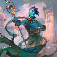 blue skin and is adorned with ornate armor, including what appears to be a crown on their head. They are holding a staff with