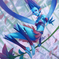 flowing hair, large wings, and is adorned in intricate feather-like garments. She appears to be perched on a stem or branch within