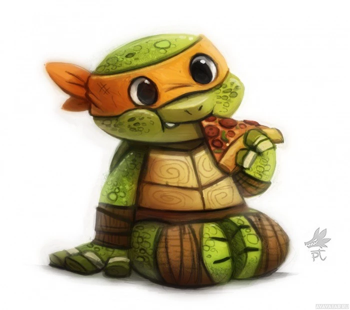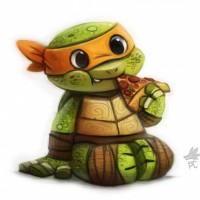 На снимке изображена милая иллюстрация Микеланджело из Teenage Mutant Ninja Turtles. Он изображен со своей фирменной банданой и держит в руках то, что кажется кусочком пиццы, готовым насладиться этим.