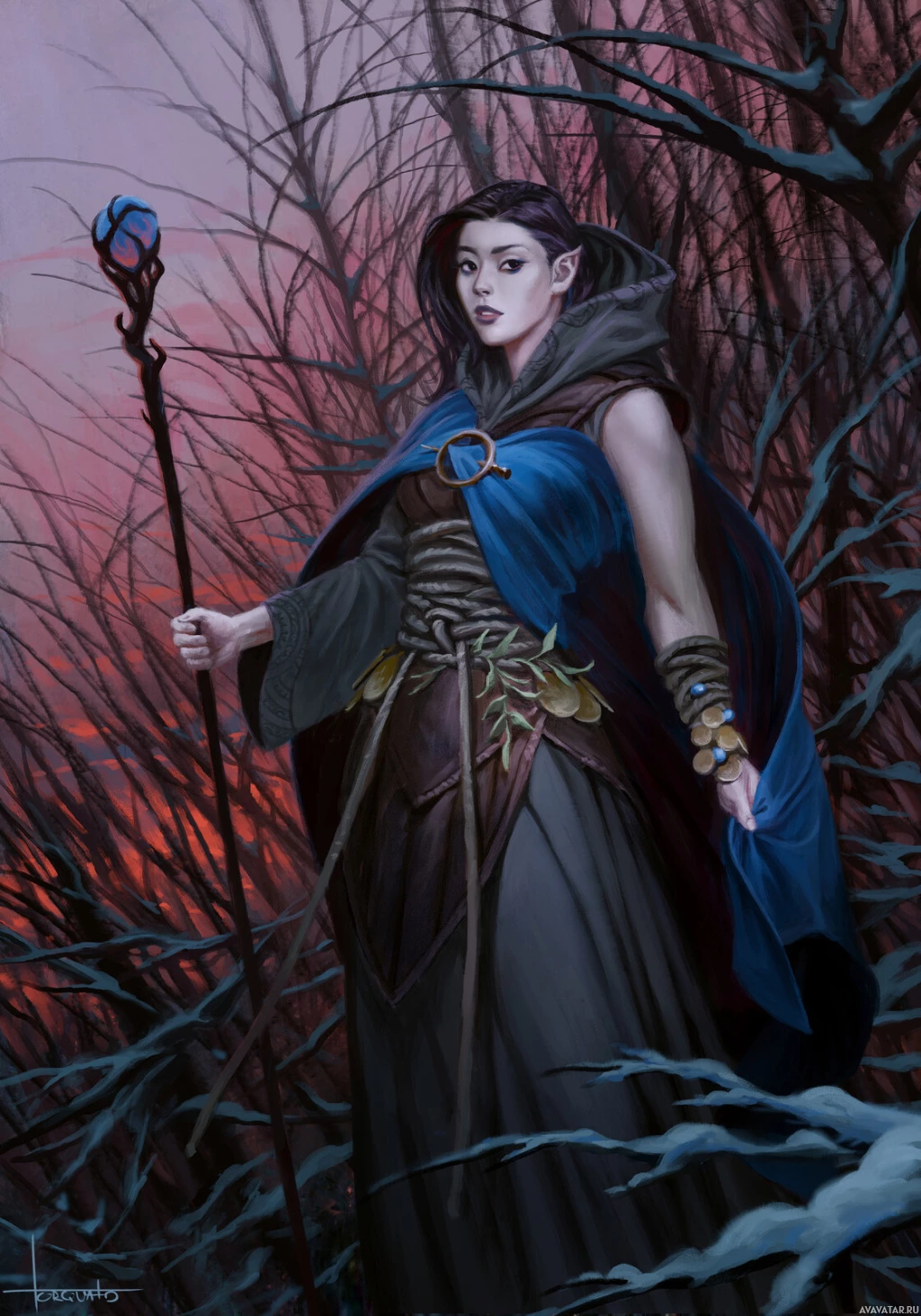 The image depicts a fantasy-themed illustration of a character who appears to be an elf. The elf is wearing a cloak and has
