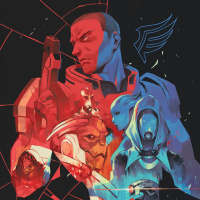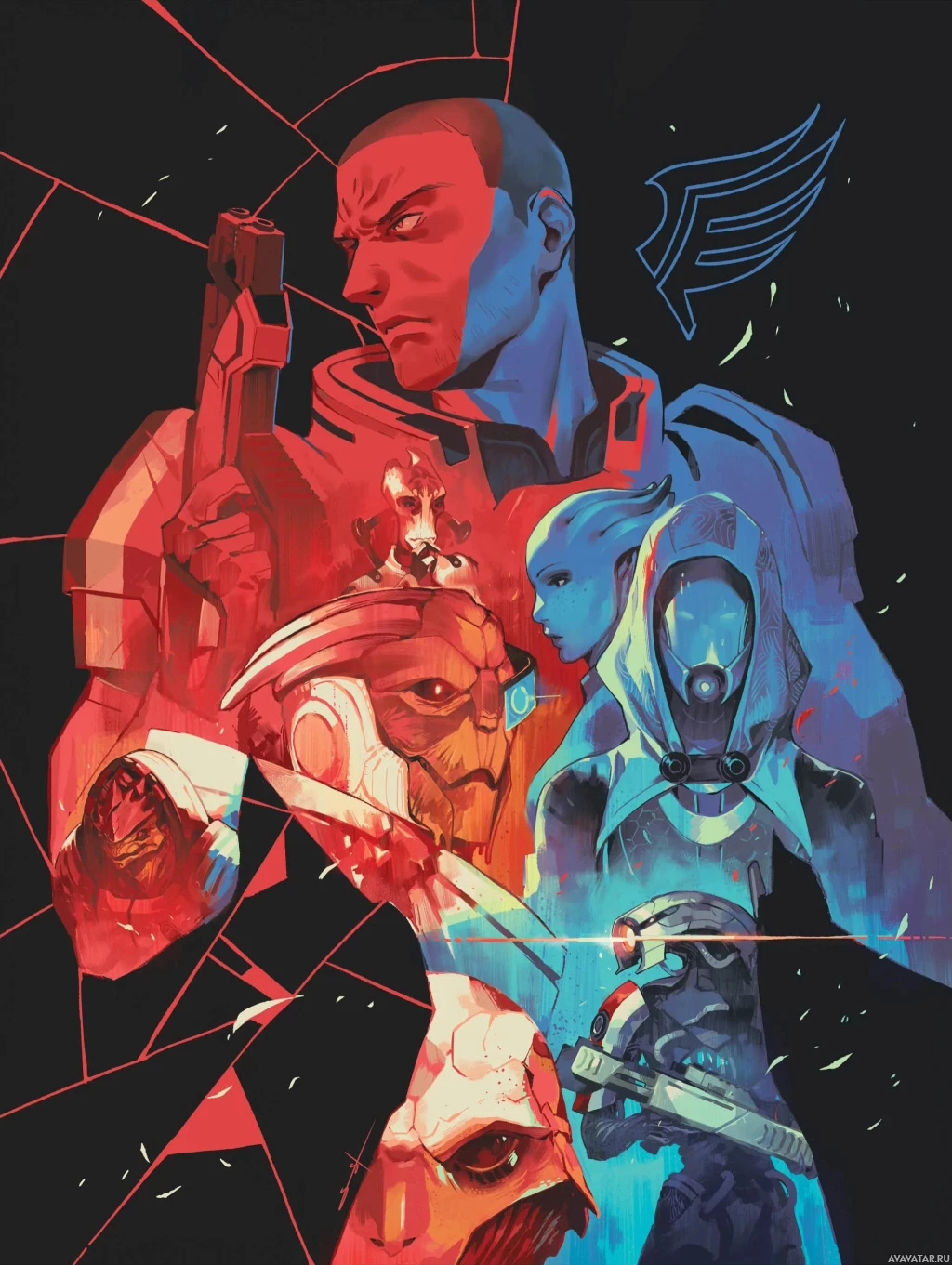 the video game series "Mass Effect." The central figure appears to be Commander Shepard, a protagonist in the Mass Effect series, flanked by various other characters, including Liara T'Soni and a character with