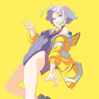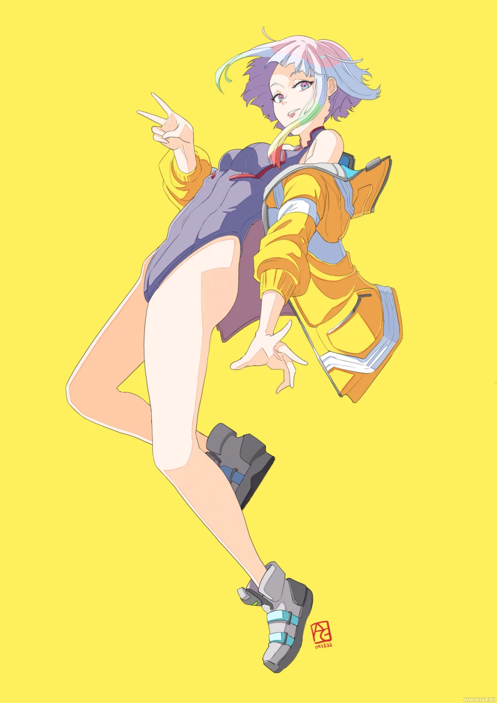 a futuristic outfit that includes what looks like a jacket and high-top sneakers. The background is plain yellow, which could be interpreted as a stylized representation of the cityscape from "Cyberpunk 2077," although it lacks specific details such as buildings or streets. The style is reminiscent of anime or manga illustrations.