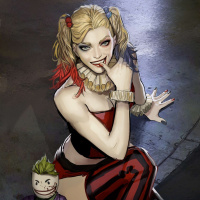 Harley Quinn, a fictional character from the Batman universe. She is depicted sitting on what appears to be