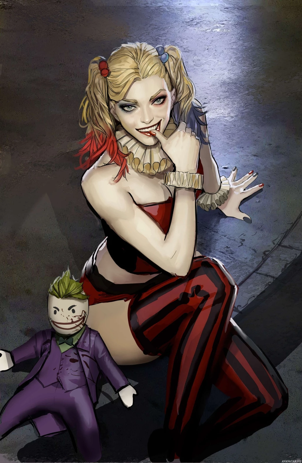 a plush toy of the Joker, which she seems to be looking at or holding. Her attire consists of her signature red, white, and black harlequin outfit. The background suggests