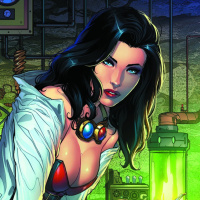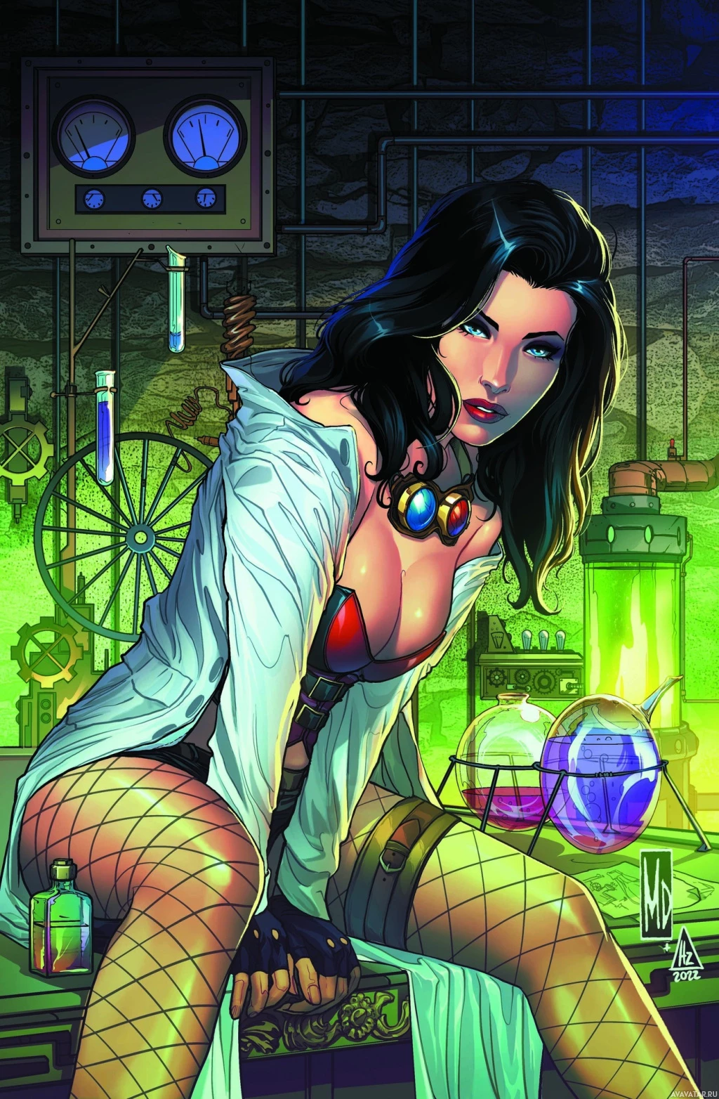 The image depicts a female character who appears to be a brunette, dressed in an attire that resembles a mix of steampunk and fantasy elements. She is sitting at a desk with various scientific equipment around her, suggesting she might be a scientist or inventor. The setting looks like a laboratory with a glowing green substance on the table, adding to the sci-fi ambiance of the scene.