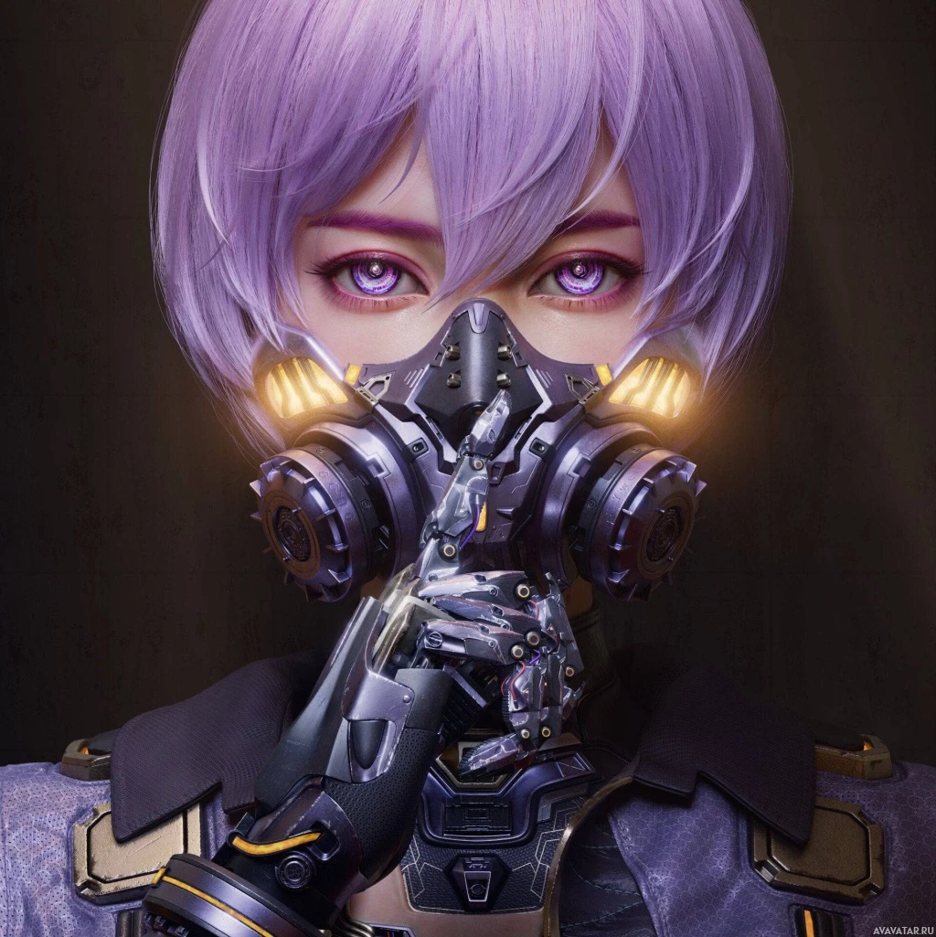 purple hair wearing a respirator mask. This character has futuristic or cyberpunk aesthetics, suggesting they might be from