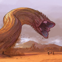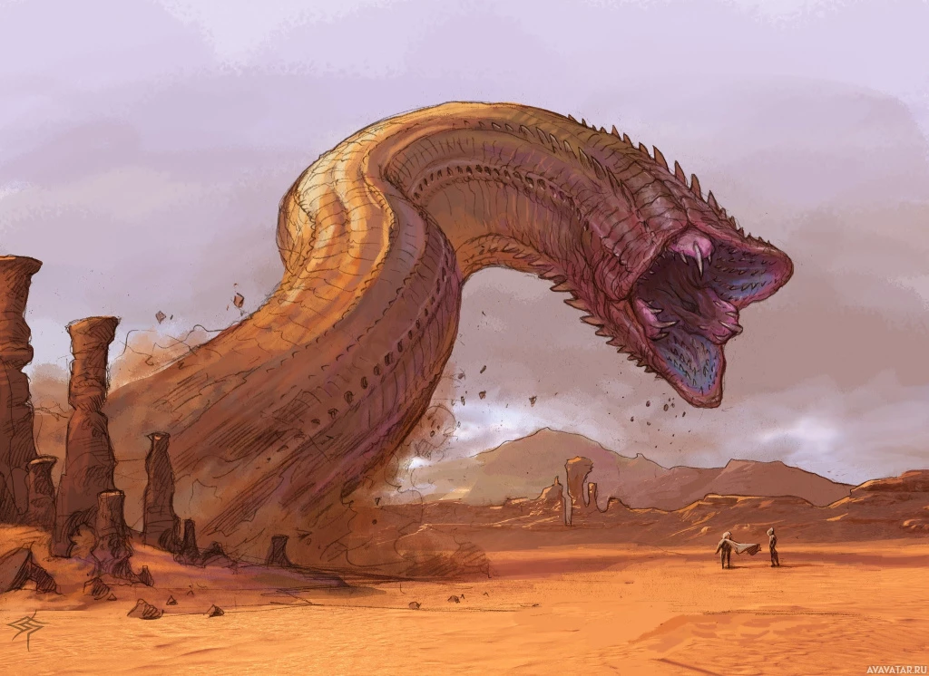 a fantastical scene set in what appears to be a desert landscape. There is a large, menacing creature with a long snout that resembles a dragon or