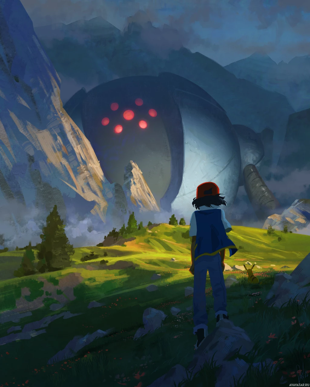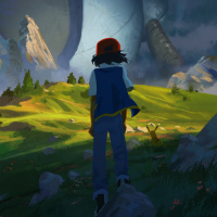 a sense of adventure and exploration as Ash appears to be facing the unknown or perhaps preparing for battle. The setting suggests a fantasy or science fiction theme, common elements in Pokémon movies where trainers embark on