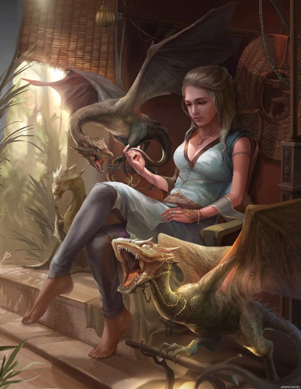 a throne with a dragon perched beside her and another one nearby. The setting suggests it could be a throne room in