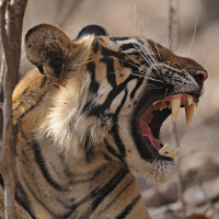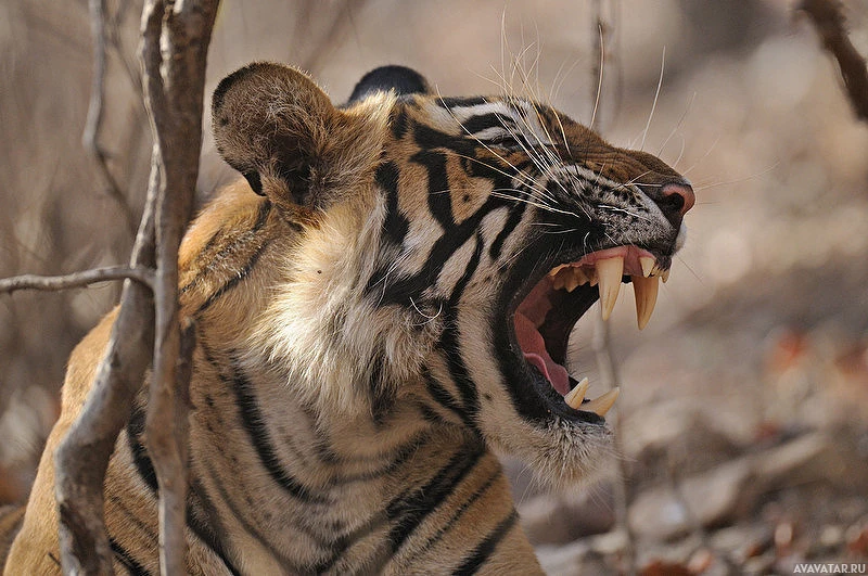 На картинке изображен тигр. На картинке изображен взрослый тигр с открытой пастью, демонстрирующей острые зубы. Обстановка выглядит как естественная среда обитания с растительностью и камнями вокруг, что наводит на мысль, что тигр может находиться в дикой природе или в вольере зоопарка, спроектированном таким образом, чтобы имитировать естественную среду обитания.
