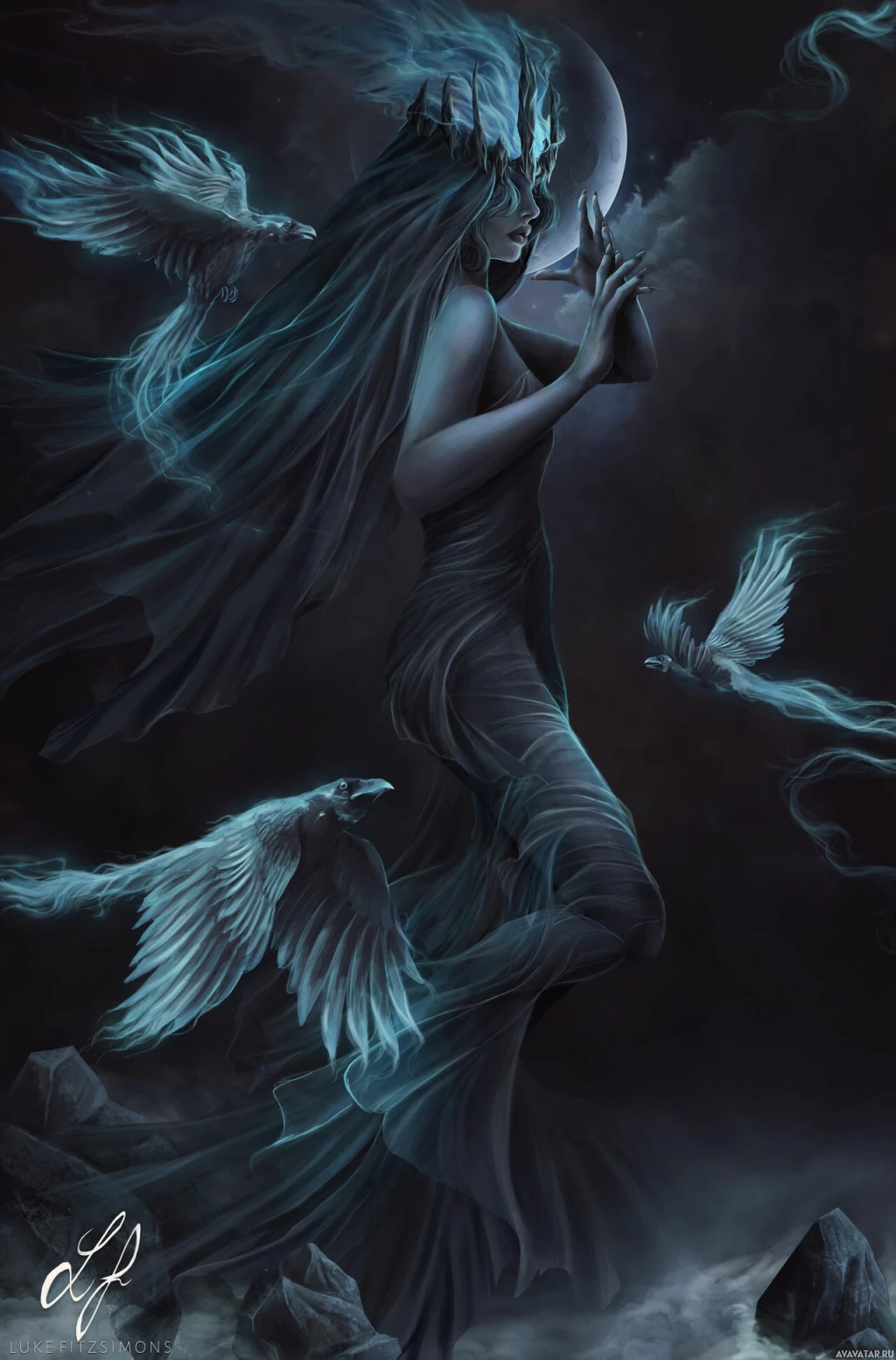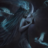 a mystical figure, given the dark attire, her connection with nature (birds), and the moonlit sky in the background. The overall mood of the image is eerie and mystical.