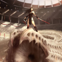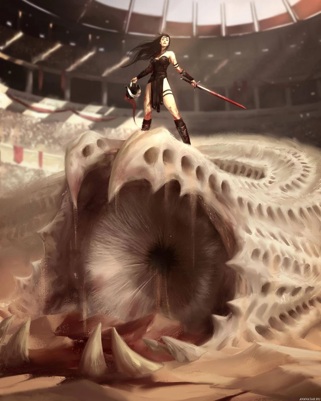 a fantasy scene with a woman standing atop what appears to be a large creature. She is holding a sword and has her hair styled in a way that suggests motion or battle-readiness. In the background, there are spectators, indicating this could be an arena setting for some