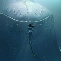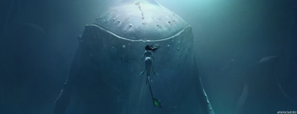 a fantasy scene with what appears to be a mermaid-like figure in the foreground. The setting suggests