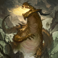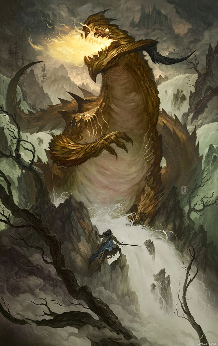 a human figure standing in front of the dragon, holding a sword, suggesting they might be in combat or confrontation with the creature. The background is dark and moody, enhancing