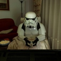The image shows a person dressed in full Stormtrooper armor from