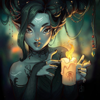 The image features a fantasy-themed character that appears to be an elf. The character has pointed ears and is holding a candle, which suggests they might be portraying a mystical or magical element often associated with fantasy themes. The elf's expression is thoughtful and contemplative as they gaze into the distance, adding to