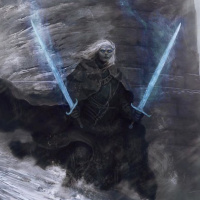 rocky terrain, possibly atop a cliff or mountain. The character is dressed in robes and holding two swords crossed in front of them, suggesting they are a warrior or guardian of some sort. In the background, there's an old,