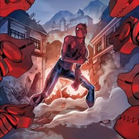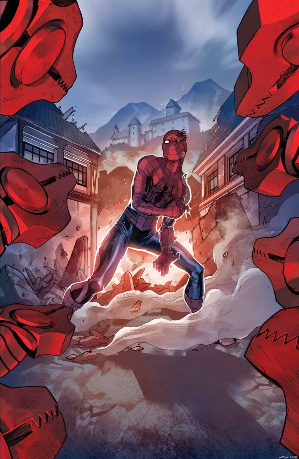 The image features a character known as Spider-Man, who is depicted in an action pose amidst what appears to be the aftermath of some