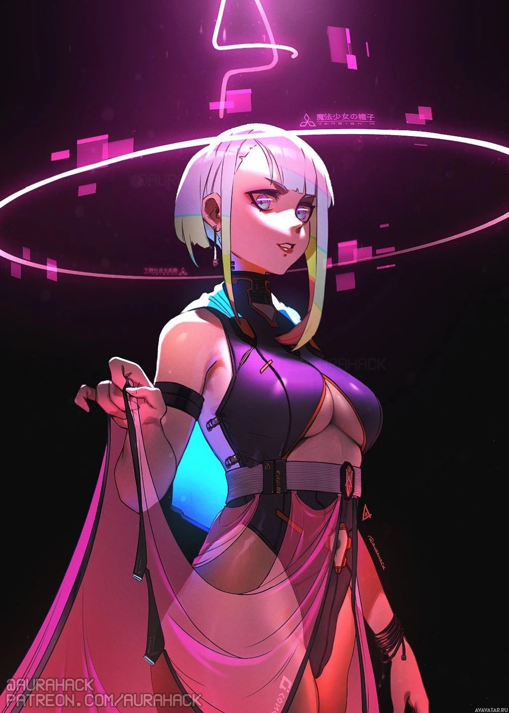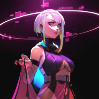 The image features a character that appears to be inspired by the game "Cyberpunk 2077." She has
