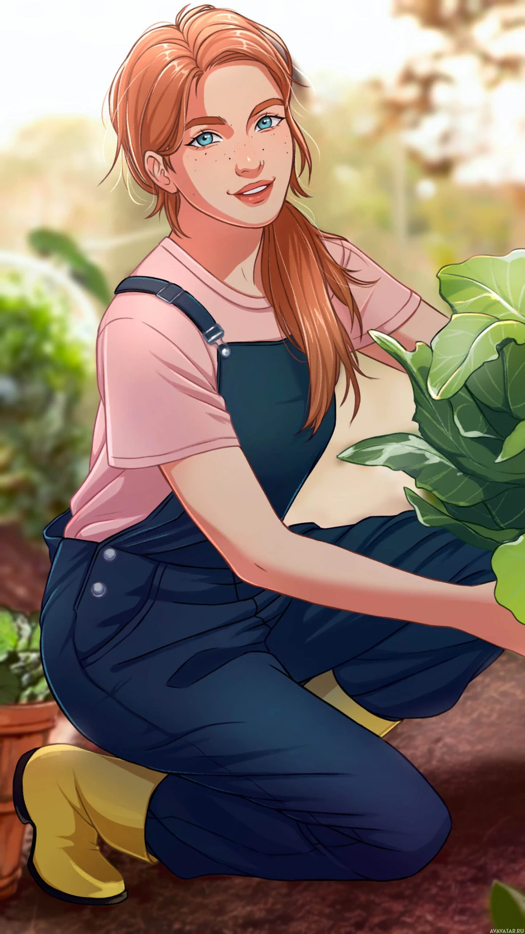 red hair. She is smiling and wearing overalls, indicating she might be working in the garden or engaged in some form of