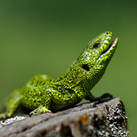 large eyes and seems alert, possibly observing its surroundings or looking for food. This type of lizard is known for its unique colors and patterns that can vary depending on the species and subspecies, providing excellent camouflage in their