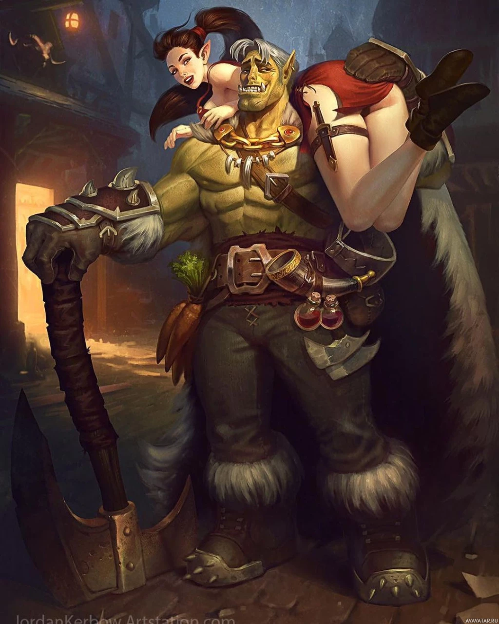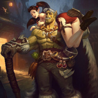 an orc character who appears to be male with green skin, a large frame, and tusks. He has horns and is wearing armor that includes a breastplate. In his hands, he holds what looks like a club or mace. On the right, there is