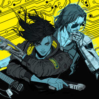 brown hair, sunglasses, and a relaxed posture; he's also armed but with different equipment. Both characters are wearing high-tech gear that suggests they are part of a cyberpunk setting, which is often characterized by