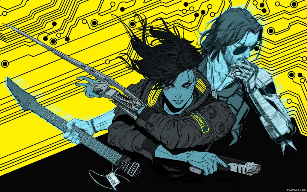 the video game "Cyberpunk 2077." The character on the left is a woman with
